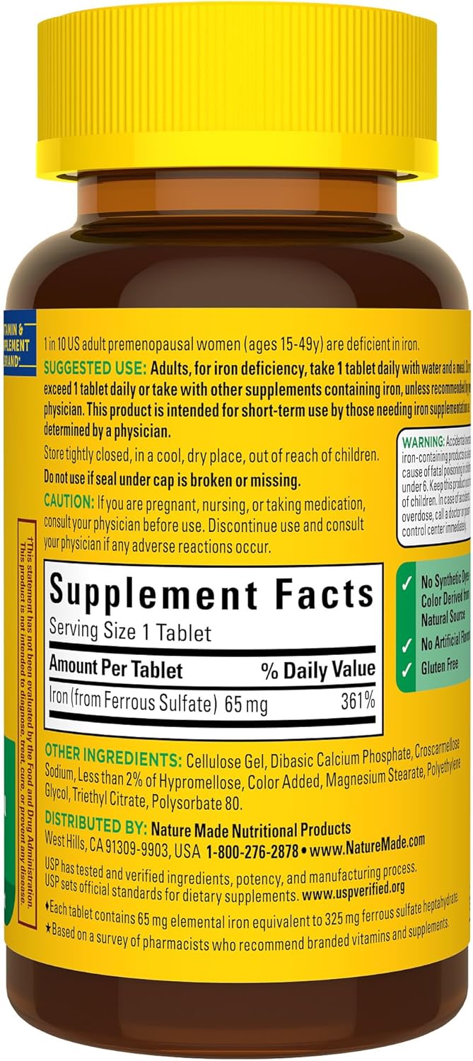 Discover the power of Nature Made Iron 65 mg (325 mg Ferrous Sulfate) Tablets, a premium supplement designed to address iron deficiency with unparalleled quality. Essential for red blood cell formation and cognitive function, this iron supplement is crafted from high-quality ingredients, ensuring it is free from synthetic dyes and artificial flavors. Tailored for both men and women, particularly premenopausal women, this gluten-free supplement is a reliable source of iron to support your body’s needs.
